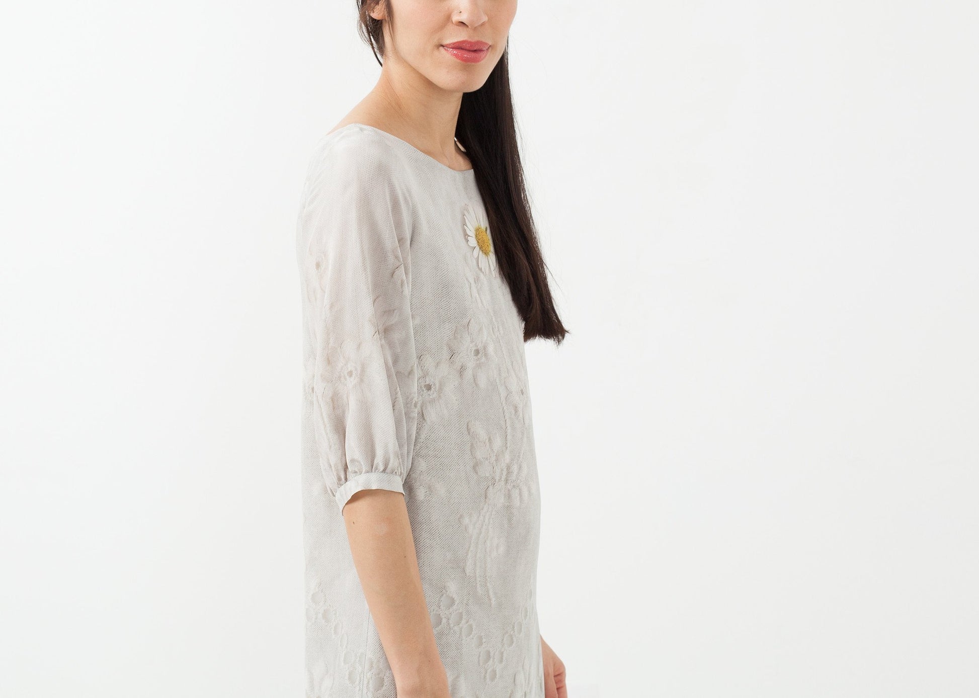 The designs of Antoni & Alison are a melange of trompe l'oeil digital imagery printed on fine silks, rendering a specified aesthetic that defines the brand and culls a dedicated clientele. The Daisy delights with its subtle textural printing and details. Flowing peasant sleeves. Wide boat neckline. Lining. Color Grey. 100% Silk. Made in the U.K. Ashley is wearing a Size 8.